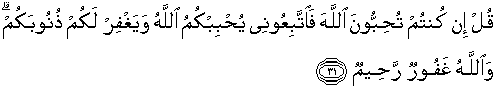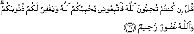 “Katakanlah (Muhammad), “Jika kamu mencintai Allah, ikutilah aku, niscaya Allah mencintaimu dan mengampuni dosa-dosamu.” Allah Maha Pengampun, Maha Penyayang.